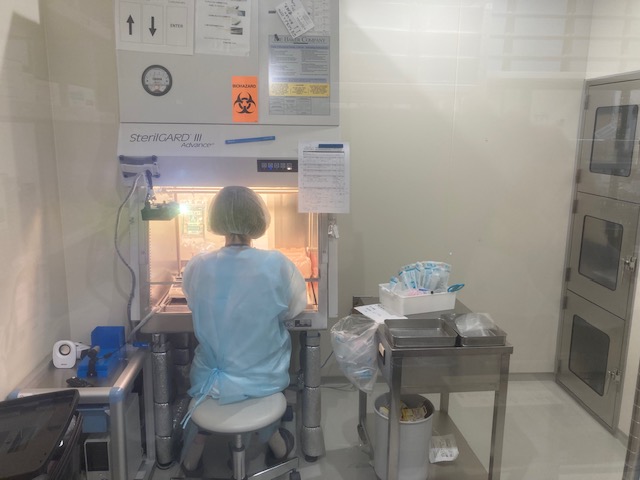 抗がん薬は、前日のレジメン監査により投与内容を確認した上で、安全キャビネットを用いて無菌調製を行ます。調製者の安全を守るため、揮発性の高い抗がん薬には閉鎖式注入器具(CSTD)を使用しています。また、混注監査システムを導入し、調製ミスの防止にも努めています。