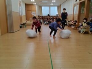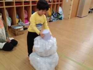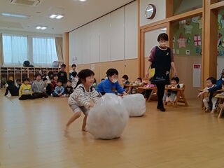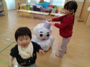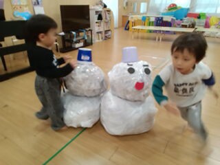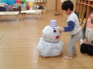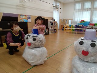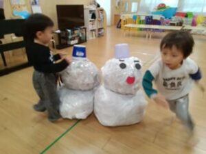 みんなで雪だるまをコロコロ転がし、雪だるまを作る競争をしました。