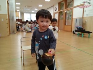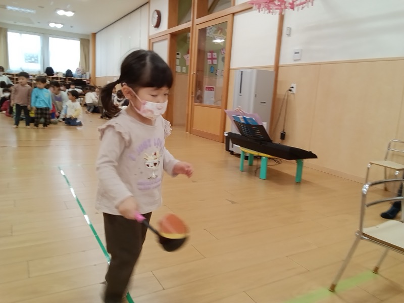 秋にちなんだくりはこびゲームではお皿やお玉にのせて、ゴールを目指し、そーっと運ぶ子どもたちでした!
