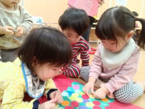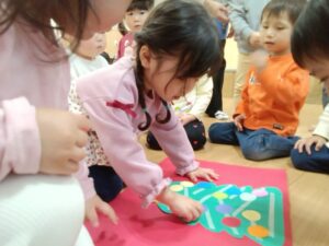 小さいクラスの子は、どこにつけようか悩みながら、思い思いの場所へつけました!